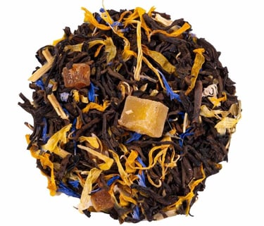 Ingredients: Pu Erh tea, candied papaya, candied mango, aroma, cornflower, marigold, passion flower